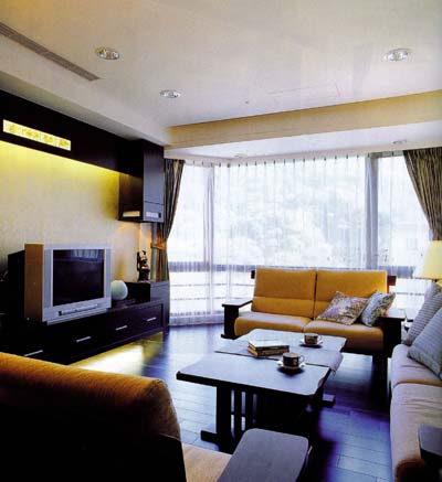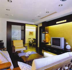 (1)上邊:.電視櫃上方鑲嵌了梅蘭竹菊圖案的琉璃,讓深色的木作也能充滿輕盈的氣息,背牆則鋪設金箔壁紙,輔以燈光照耀,壁紙的光澤與琉璃的通透,讓客廳除了日間的光線的游移變化,在入夜開燈時,也能享受不同角度的光影之美。