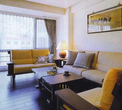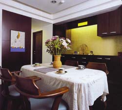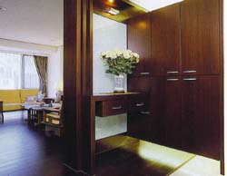 (5)因大廈樑柱大,設計師不採取包 樑方式處理,反將柜面拉齊,成功打 造出餐廳的壁柜。而壁柜處延續客廳 主題也使用金箔壁紙;不過,此處鑲 嵌的是黃色彩雕玻璃。 設計師表示,與牆面相似的顏色除了有配搭意涵,亦不會搶了一旁彩繪 玻璃的丰耒,今餐廳的焦點集中而不顯 凌亂。 | |||||